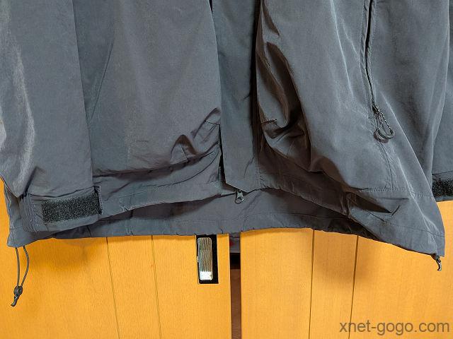 身幅が広いので裾は幅広になっているが、ドローコードを引っ張れば裾が締められるので、風が強い日や自転車に乗るときに重宝する。