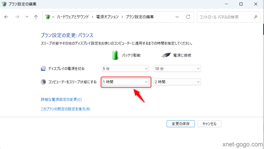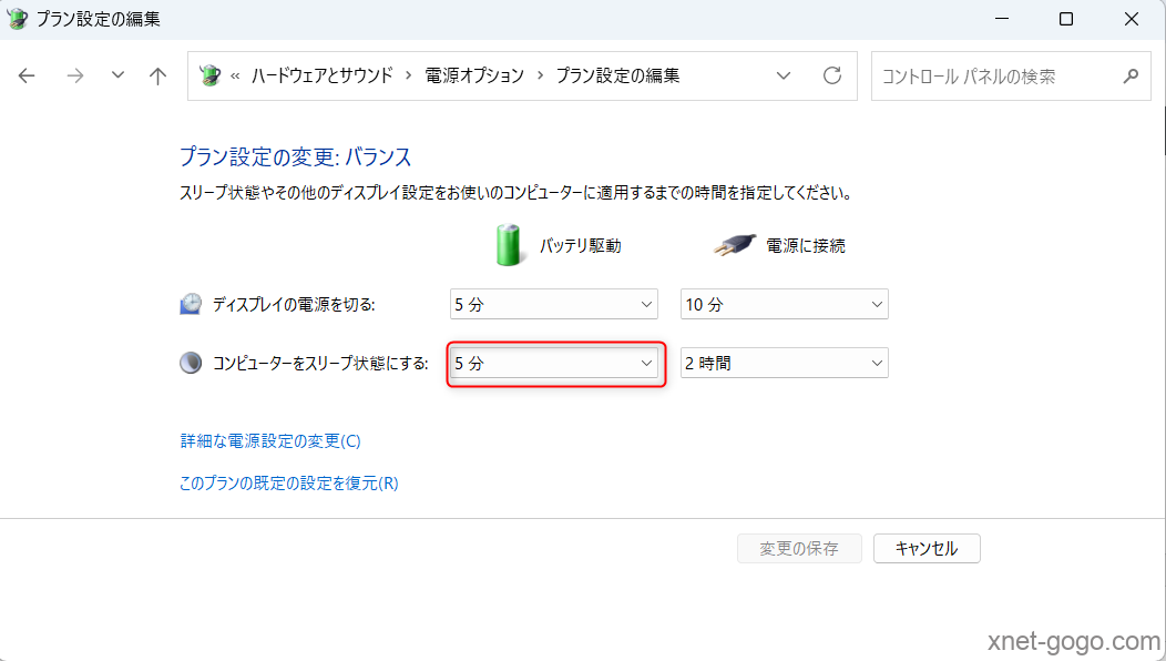 これを「コンピューターをスリープにする」を「ディスプレイの電源を切る」と同じ時間にして、「変更の保存」をクリックする。