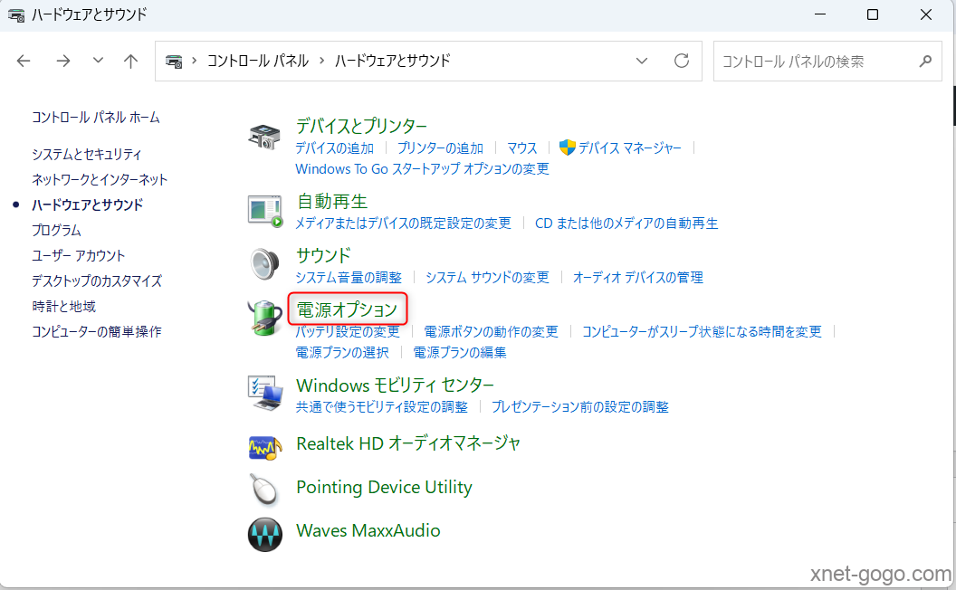 まず、コントロールパネルを開き、「ハードウェアとサウンド」をクリックすると下記の画面になるので「電源オプション」をクリックする。